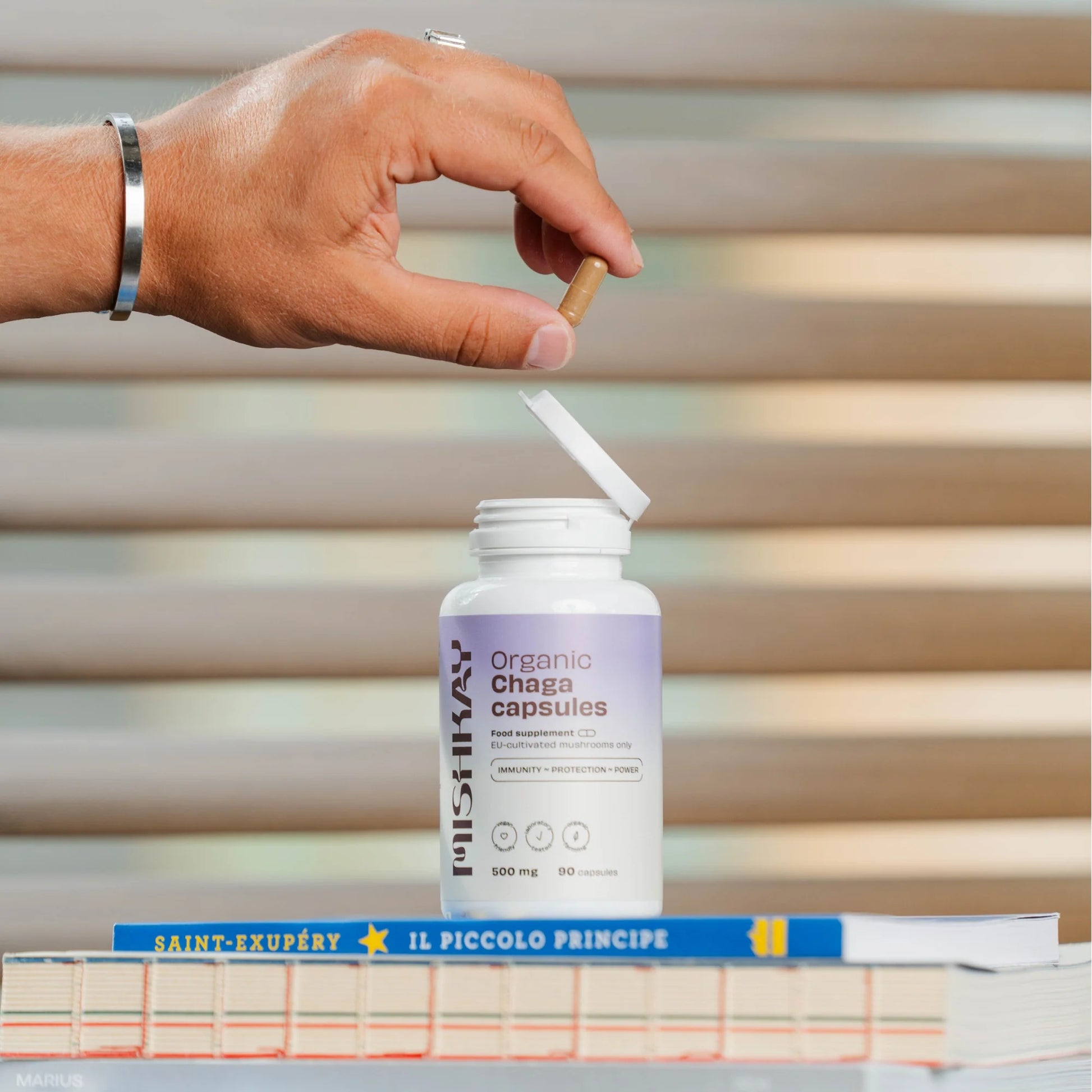 Sudedamosios dalys: beržo juodgrybio (Inonotus Obliquus*) milteliai, hipromeliozė (veganiškas kapsulės apvalkalas). *iš ekologinio ūkio