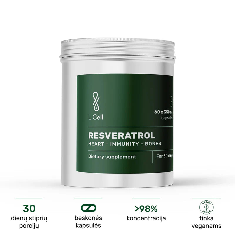 - Ilgaamžiškumas. Resveratrolis yra senomorfinis preparatas, blokuojantis SASP (ląstelių uždegimo priežasties) plitimą, ir antioksidantas, apsaugantis mūsų ląsteles nuo žalingų laisvųjų radikalų.